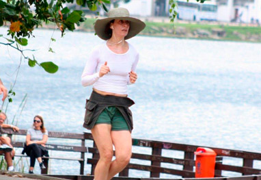 De short, blusa de manga comprida e uma espécie de cinto com bolsos para guardar coisas, ela não perdeu o ritmo durante sua corrida.
